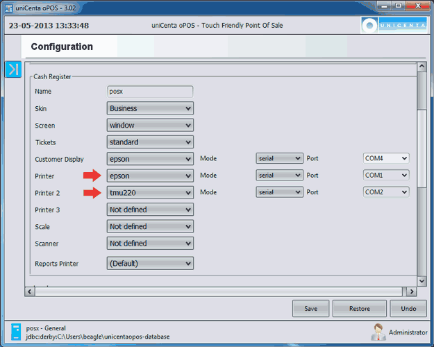 Configuration of the printer in uniCenta is show as "Printer 2"