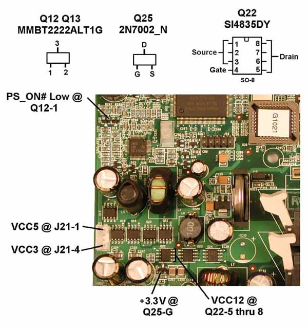 1.Start with PS_ON# at the base of Q12 or Q13. It should be low.