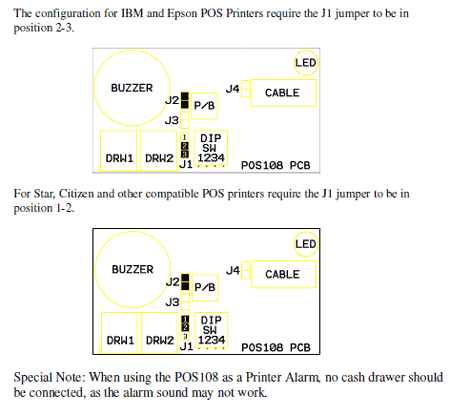 Drawer Alarm options. The POS buzzer also splits the cash drawer port of