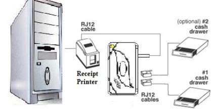 RJ12of receipt printer cash drawer port. (2 Drawer function is limited to