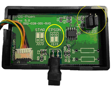 Opened paper sensor showing 2 jumpers inserted in the Epson position