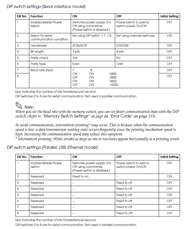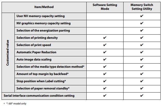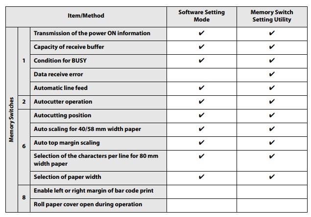 Utility, Software Setting Mode, or ESC/POS commands, to set memory switches and